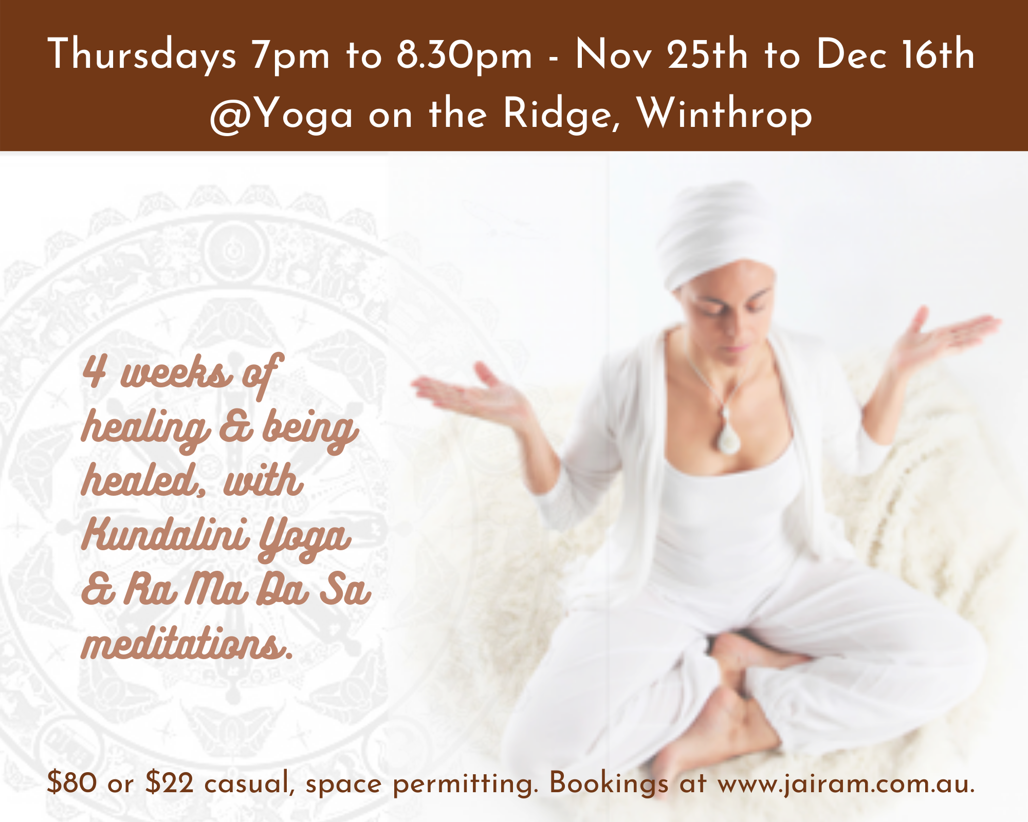 At each of these 4 classes you will be guided to practice a Kundalini Yoga kriya to prepare yourself for a healing meditation using the mantra. There are variations of the healing meditation that we will practice, and over the 4 weeks you will be given the opportunity to be both giver and receiver as you practice for yourself, or in a pair or in a circle.